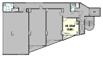 【代々木エリア:貸店舗・事務所】 ≪メリット≫ 水回りが1箇所にまとまっています。 ≪デメリット≫ レイアウトに工夫が必要な変形した間取りです。
