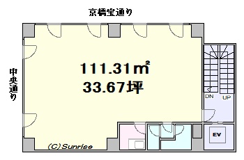 【京橋エリア:貸事務所】 ≪メリット≫ 窓面が広く明るい室内。レイアウトし易い整形。 ≪デメリット≫ EVの手前に階段が有り、荷物搬出入の際はご注意。
